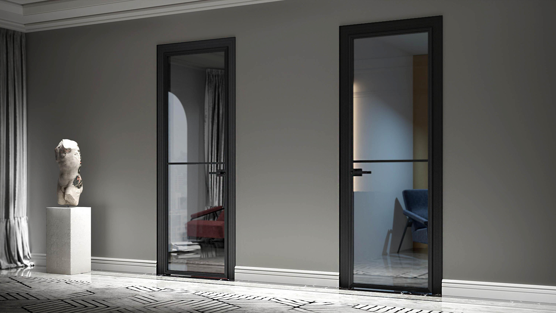 Распашная дверь с минимальным алюминиевым профилем и скрытыми петлями