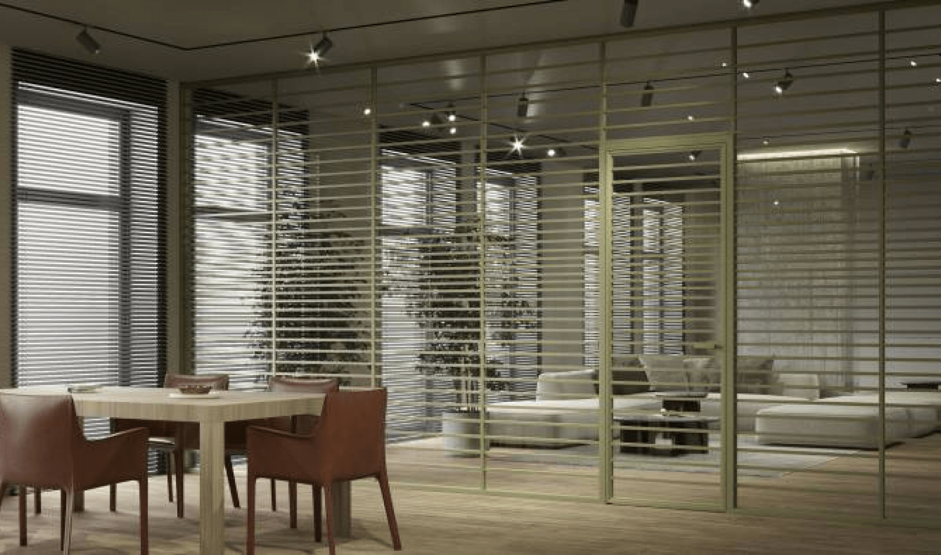 Чтобы выполнить все эти задачи, мы разработали самые тонкие на рынке профили: воздушные, со скрытыми петлями. Корпусы перегородок мы реализовали замком — и это самые миниатюрные и аккуратные замки на рынке. А общая конструкция позволяет использовать практически любое количество перемычек в перегородках для адаптации под дизайн.