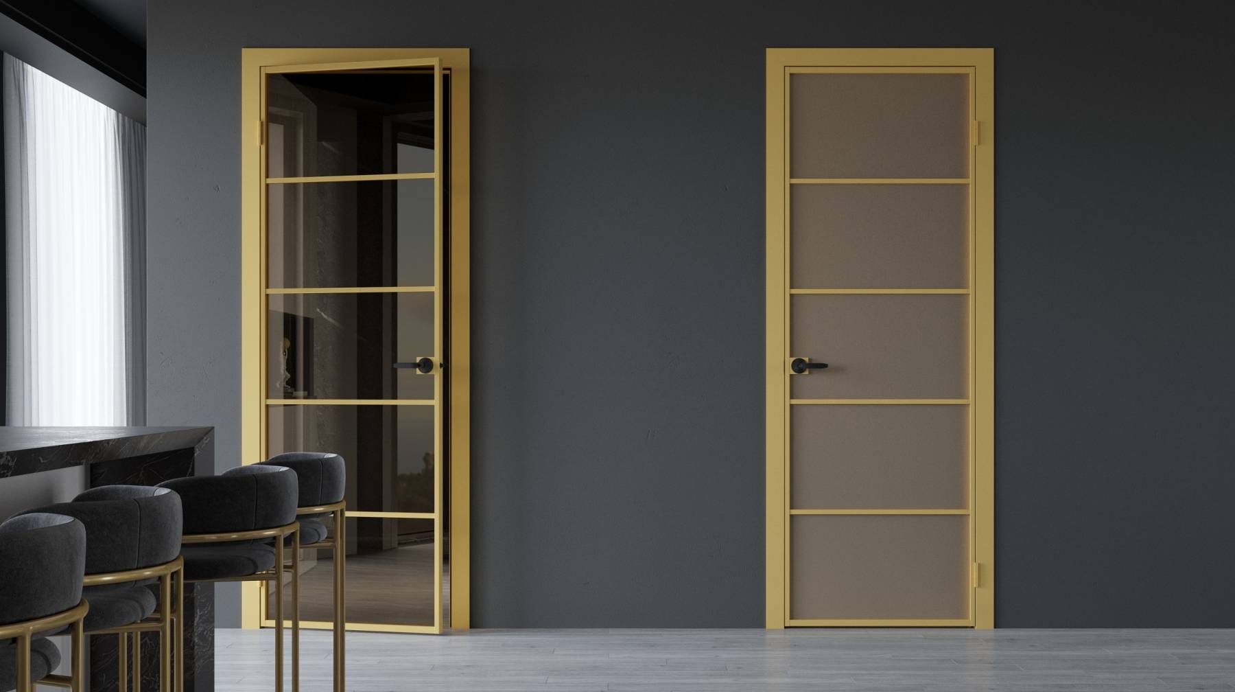 Для loft-дизайна мы разработали систему перегородок с распашными дверьми для зонирования пространств. Задача такой системы - быть максимально легкой, универсальной. Распашные двери в этих перегородках могут быть как высотой до потолка, так и реализованы с фрамугами.