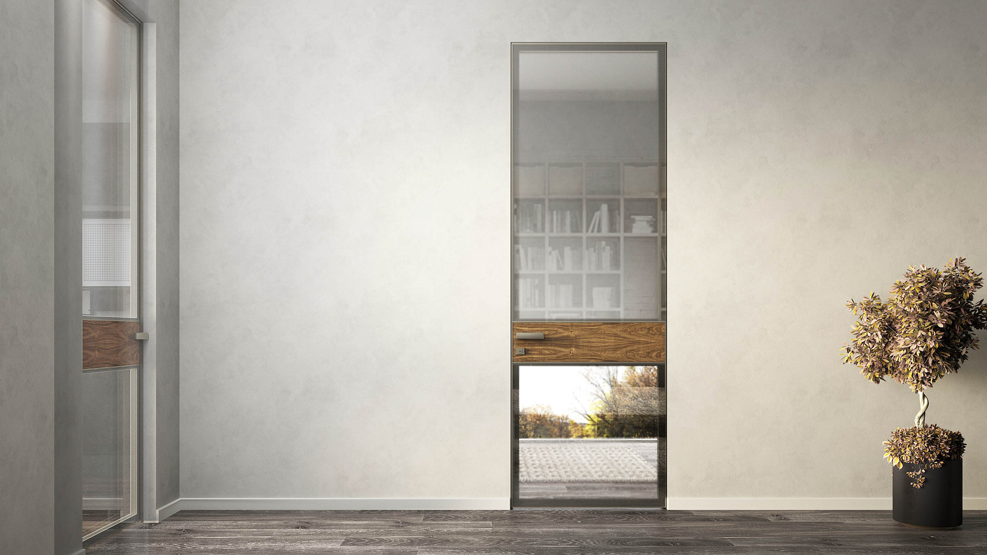 Дверное полотно с алюминиевым профилем с видимой кромкой 8мм. Толщина полотна 45 мм Возможность использования множества материалов для отделки, таких как : стекло 4мм, зеркало 4мм, МДФ шпонированный, МДФ крашенный, Керамогранит, HPL композит, а также ваш материал(по предварительному согласованию возможности его установки). Используются петли скрытой установки OTLAV IN300 и усиленные OTLAV IN303 (Италия). Универсальный замок FORME (Италия), совместимый практически со всеми универсальными нажимными ручками разных производителей (FORME, TUPAI, HAFELE и др.).