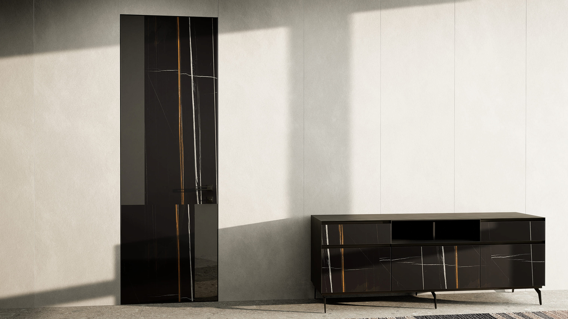 Дверное полотно с алюминиевым профилем с видимой кромкой 3мм. Толщина полотна 45 мм Возможность использования множества материалов для отделки, таких как : стекло 4мм, зеркало 4мм, МДФ шпонированный, МДФ крашенный, Керамогранит, HPL композит, а также ваш материал(по предварительному согласованию возможности его установки). Используются петли скрытой установки OTLAV IN300 и усиленные OTLAV IN303 (Италия). Универсальный замок FORME (Италия), совместимый практически со всеми универсальными нажимными ручками разных производителей (FORME, TUPAI, HAFELE и др.).